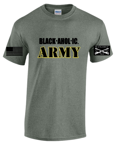 The front features the signature BLACK·AHOL·IC. typography paired with a striking ARMY print in bold yellow outline—a powerful combination that honors strength and heritage. The left sleeve displays a monochrome American flag, while the right sleeve features a custom Blackaholic insignia, adding authentic military-style detailing that completes the look.