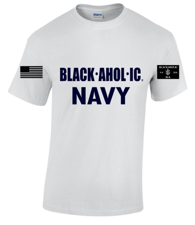 Featuring the signature BLACK·AHOL·IC. branding across the chest with NAVY lettering in a camo-inspired military font, this design commands attention without saying a word. The left sleeve displays a monochrome American flag, while the right sleeve features a custom Blackaholic insignia—adding authentic, service-inspired detail.