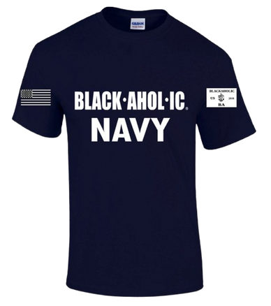 Featuring the signature BLACK·AHOL·IC. branding across the chest with NAVY lettering in a white lettering-inspired military font, this design commands attention without saying a word. The left sleeve displays a monochrome American flag, while the right sleeve features a custom Blackaholic insignia—adding authentic, service-inspired detail.